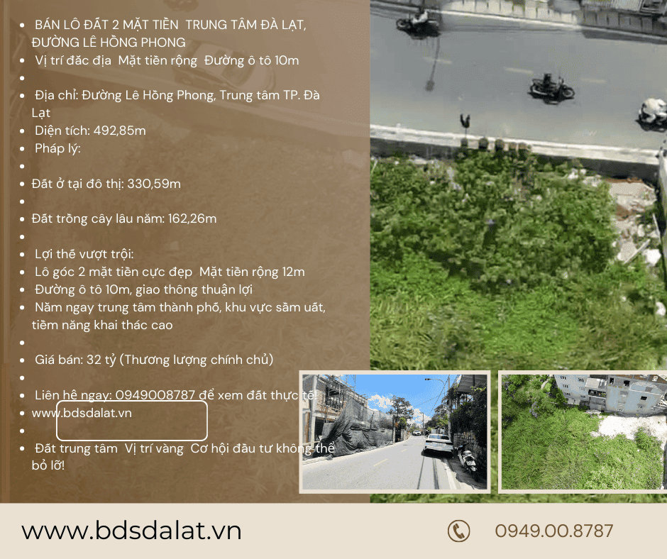 ???? BÁN LÔ ĐẤT 2 MẶT TIỀN – TRUNG TÂM ĐÀ LẠT, ĐƯỜNG LÊ HỒNG PHONG ???? 493m / Giá : 32 tỷ