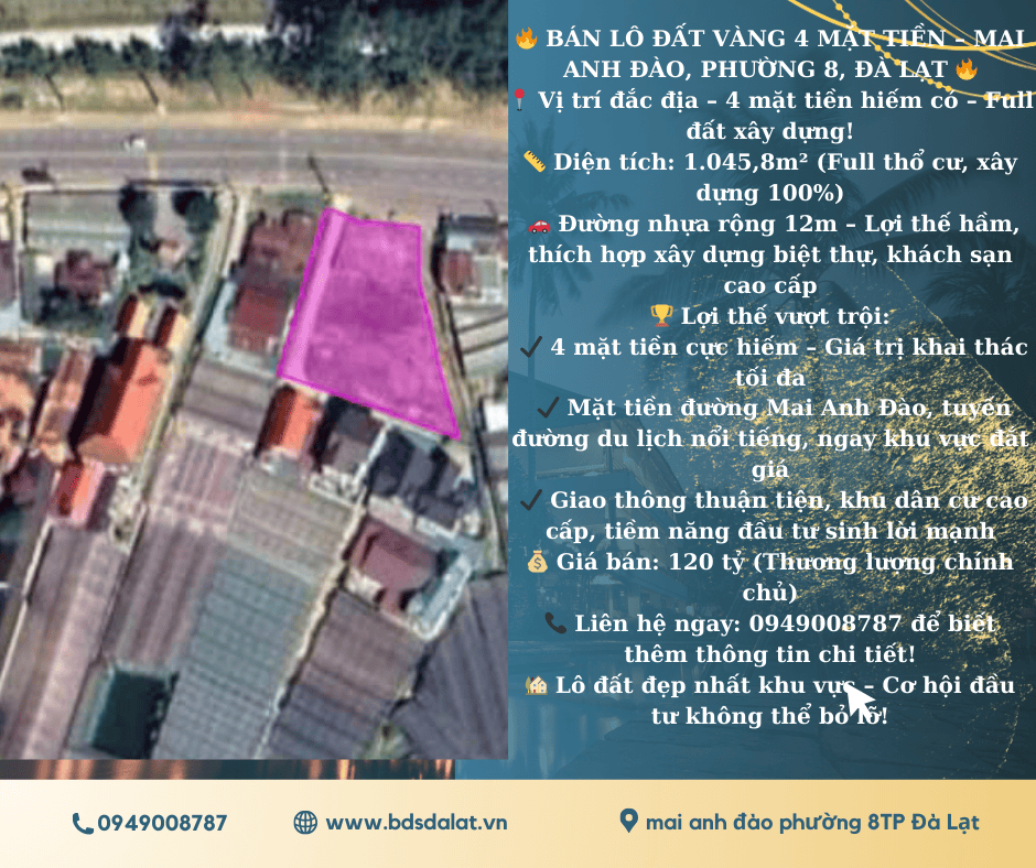 BÁN LÔ ĐẤT VÀNG 4 MẶT TIỀN – MAI ANH ĐÀO, PHƯỜNG 8, ĐÀ LẠT ???? DT : 1045m2 Giá : 120 tỷ